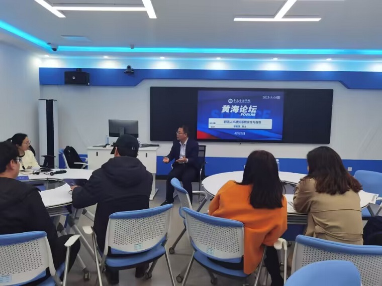 4月26日下午,第4期黄海论坛邀请东南大学李新德教授做报告。李教授第一场报告主题是《群无人机感知系统安全与自愈》,第二场面向学生知行讲堂的报告主题是《传承家国情怀,引领机器人自主创新梦》。报告采用线上线下相结合的形式进行,师生300余人参加了本次活动,报告会由智能制造学院副院长陈玉杰主持。