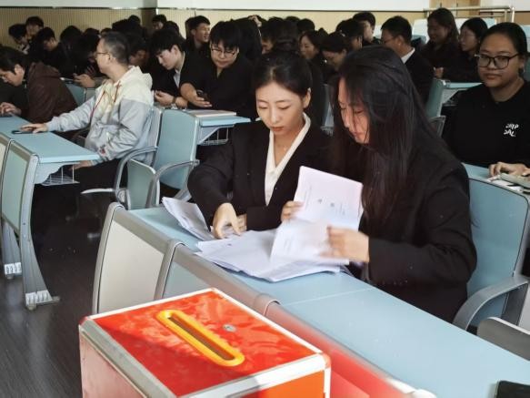 选举环节严格遵循规范流程,总监票人龚玉娇、总计票人李雨梦等工作人员首先完成到会代表人数核实、票箱检查等准备工作,随后向与会代表分发选票。各位代表认真研读选票填写说明,以无记名投票的方式依法行使民主权利,有序投下自己庄严的一票。