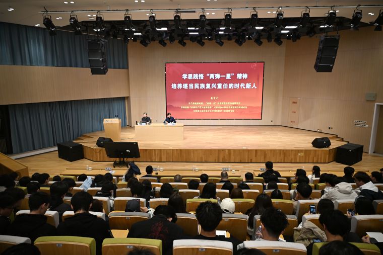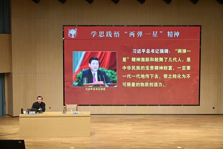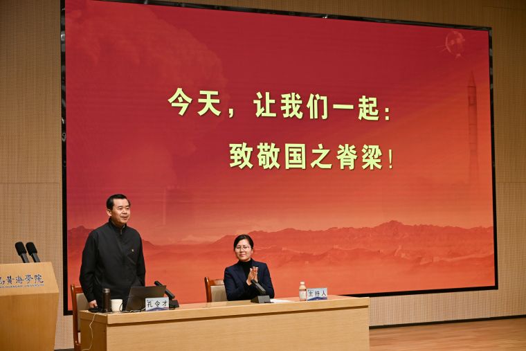 座谈交流结束后,专题讲座于17时在知信楼306报告厅正式开讲。孔令才少将以《学习传承“两弹一星”精神,培养堪当民族复兴重任的时代新人》为题,结合自身四十余年深耕国防科技和武器装备建设战线的亲身经历,为现场师生带来了一场兼具思想深度、历史厚度和情感温度的精神盛宴。讲座中,他从“两弹一星”精神的历史背景、核心内涵和时代价值切入,通过一个个鲜活的历史故事、一段段珍贵的奋斗细节,全景式再现了“两弹一星”事业波澜壮阔的发展历程,生动讲述了钱学森、邓稼先、林俊德等老一辈科学家,在戈壁荒漠中战天斗地、隐姓埋名、攻坚克难、无私奉献的辉煌事迹,深刻阐释了“两弹一星”精神与钱学森精神一脉相承的爱国内核和精神底色,让在场师生深受触动、倍感振奋。