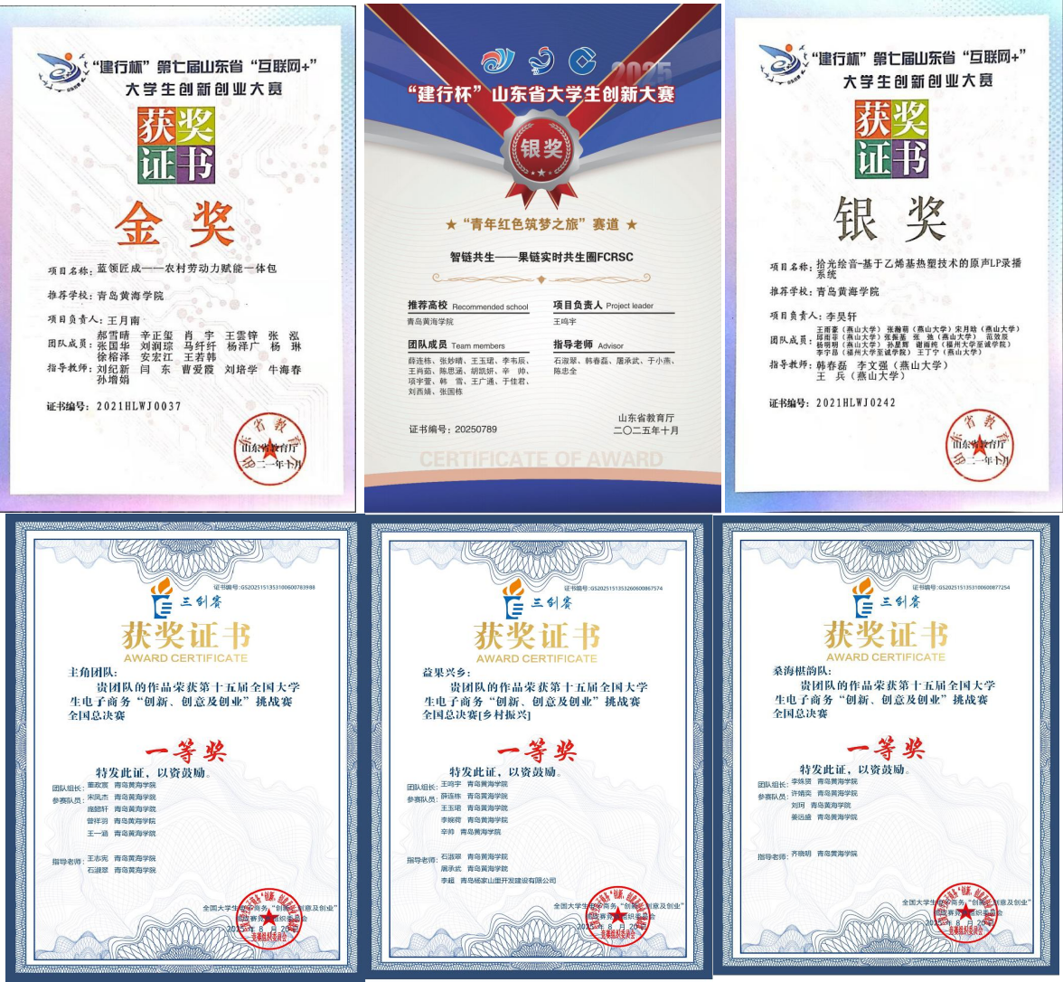 学院始终坚持以赛促教、以赛促学、以赛促练,人才培养成效持续彰显。近五年指导学生参加各级学科竞赛屡创佳绩,2021年获国家级奖项23项、2022年53项、2023年100项、2024年68项、2025年58项,人才培养质量持续攀升。据麦可思2024年调研报告,毕业生就业满意度98.18%,岗位适应性95.18%。涌现出以年营收超亿元的王乃墩为代表的一批行业领军人才。王乃墩通过校企合作项目学习跨境电商,在校期间即成功获取百万美元海外订单,毕业后创办青岛东方世茂公司,年销售额1.2亿元,实现自主品牌出海,现为阿里巴巴国际站全国明星讲师。