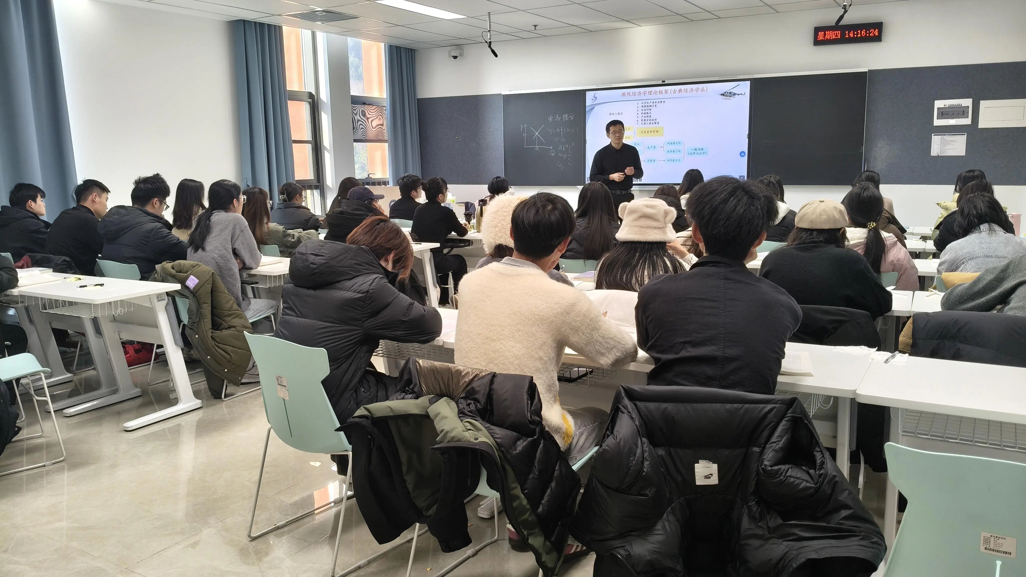 讲座过程中,王舒鸿教授采用深入浅出的授课方式,兼顾知识的广度与深度。他将古典学派与凯恩斯学派的百年论争解读为“自由之手”与“扶持之手”的理论对话,把复杂的IS-LM模型转化为商品市场与金融市场的互动逻辑,并结合美元霸权的历史发展与中国经济“新常态”面临的挑战展开分析,既展现了宏观的全球视野,也体现了鲜明的现实关怀。他特别强调:“学习经济学,关键不是记住结论,而是掌握其背后的逻辑思维模式”,为在场学子的学习指明了方向。