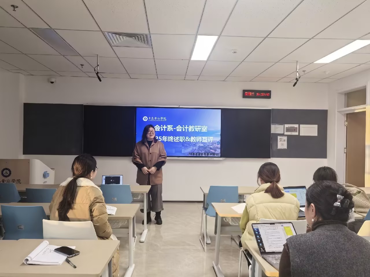 随后,述职环节正式展开。财务管理与会计两个教研室的述职工作由两位教研室负责人带领,分别在知信楼408、409教室展开。教师们依次围绕教学、学生培养、科研三大核心领域,结合具体数据与案例,全面回顾了本年度工作情况。在教学方面,多位教师分享了创新教学方法的实践成果,如引入案例教学、开展翻转课堂等,有效提升了课堂互动性与学生参与度;学生培养环节,教师们重点介绍了指导学生竞赛、实习实践及职业规划等方面的经验,展现了以生为本的教育理念;科研领域,部分教师汇报了课题申报、论文发表及学术交流的进展,凸显了教研室科研实力的稳步提升。