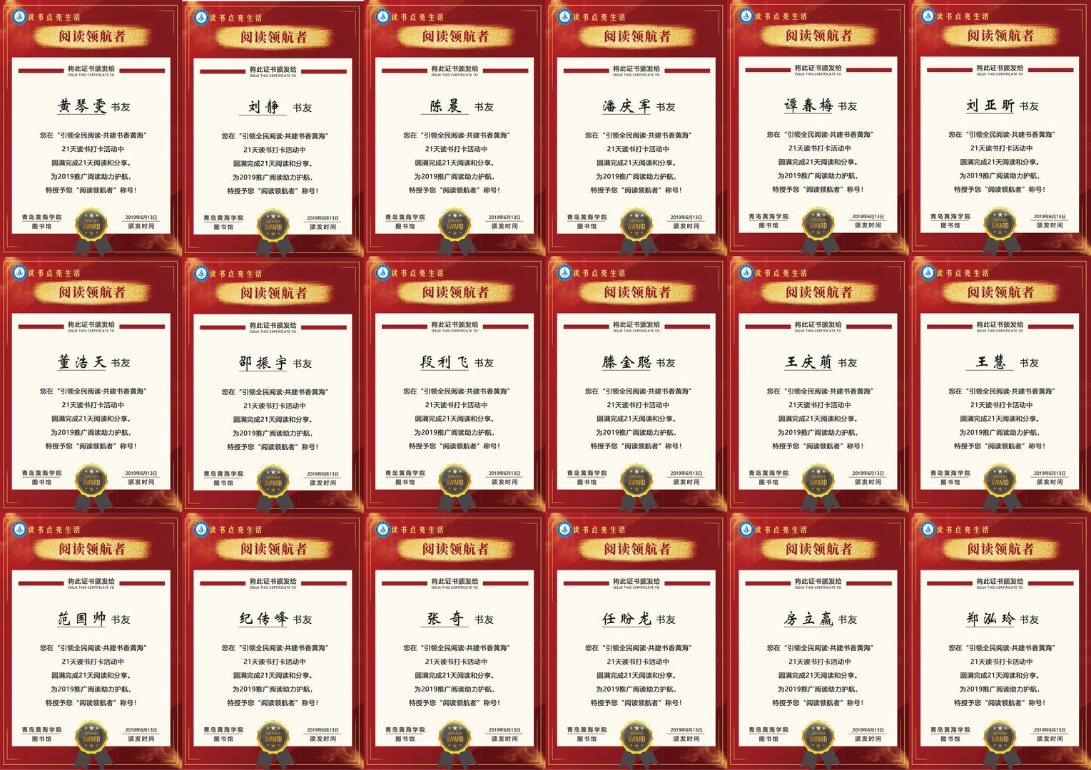 21天读书打卡活动从5月17日至6月6日在学校部分范围内开展,得到了学校团委领导的大力支持,图书馆各分部通力合作,积极组织推广本活动,广大师生更是热情参与。本次活动激发了同学们的阅读兴趣,培养了坚持阅读的好习惯。经过21天的坚持,共有18位书友获得了图书馆授予的“阅读领航者”称号。