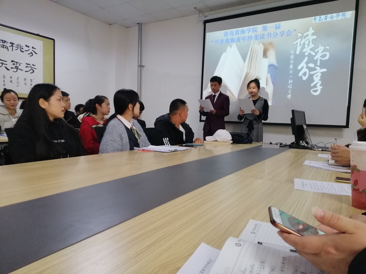 为营造浓郁读书氛围,打造书香校园,让读书成为一种习惯,让读书活动构建学生成长平台。以我校团委和信息资源部主办,学前教育学院承办的第一届“书香黄海.青年沙龙读书分享会”于2019年11月20日下午两点在图书馆二楼会议室召开。青岛黄海学院团委张湘老师、信息资源部副部长徐伟、图书馆流通部主任李爱华、图书馆办公室主任张秋凤、图书馆采编部主任付淑霞、校团委学生联合会副书记张玉华和学生代表郭诗琪作为特邀评委出席了本次分享会。参与分享会的有学校各二级学院的代表者以及读书爱好者近40人。