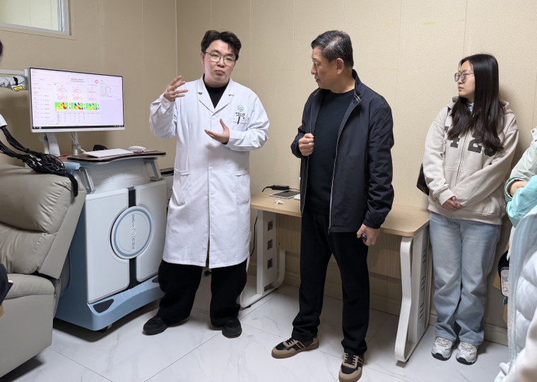 医院王院长与孙主任向黄海学院一行介绍院内主要科室,指导师生们亲身体验近红外FNIRS、AI心理健康智能检测、眼动评估、经颅磁治疗与全自动导航TMS,并详细介绍了心理CT、烟酸检测、MST治疗仪等前端治疗手段。随后,孙主任带领教师们前往住院区参观。