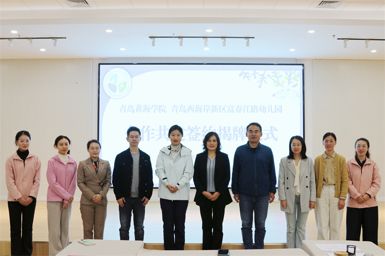 随后,双方领导共同为青岛黄海学院和富春江路幼儿园“党建联建共建单位”“双师型教师培养基地”“教学实践基地”“产学研基地”揭牌。红色绸布缓缓揭开,标志着合作正式启动。