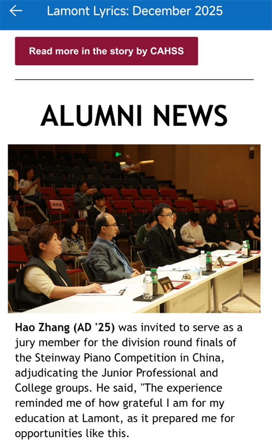2025年10月,青岛黄海学院教育学院专任教师张皓,系美国丹佛大学拉蒙特音乐学院毕业博士,受邀担任2025年度施坦威全国青少年钢琴比赛青岛地区预选赛决赛评委,负责专业组、青年组与高校组选手的评审工作。这一事迹被收录于丹佛大学人文与社会科学学院(CAHSS)发布的拉蒙特音乐学院校友通讯《Lamont Lyrics》2025年12月期,其专业能力获得业界权威认可。