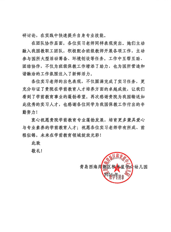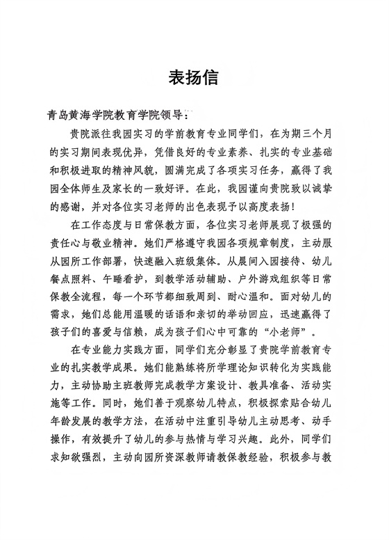 实践期间,教育学院学子始终坚守教育初心,在实习与见习工作中展现出过硬的专业功底与良好的师德风貌,赢得了实践基地师生的一致好评。此次收获的多份表扬信,既是对我校实践育人工作的肯定,更是一种鞭策。未来,学校及学院将持续深化实践教学改革,完善协同育人模式,为培养高素质基础教育人才贡献更大力量。
