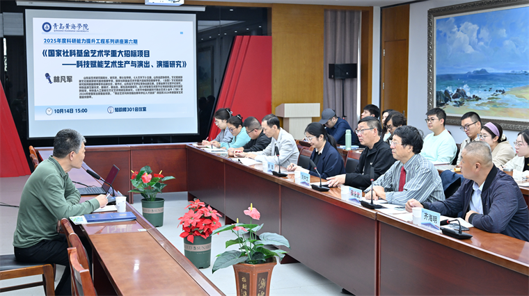 10月14日下午,文化和旅游部文化和旅游研究基地首席专家、国家社科基金艺术学重大招标项目首席专家、山东省艺术研究院院长、研究员、博士生导师林凡军教授受邀到访青岛黄海学院影视学院,作题为 “科技赋能艺术生产与演出、演播研究” 的专题讲座,青岛黄海学院科研服务部部长刘中文、部长助理李霖,青岛黄海学院影视学院院长薛永武、副院长李岳、副院长齐海明,影视学院、设计美术学院、教育学院各系部负责同志和骨干教师以及学生代表参加活动。