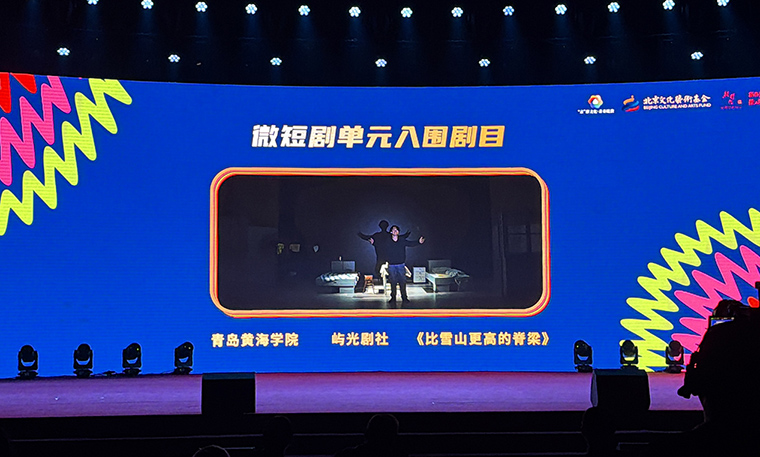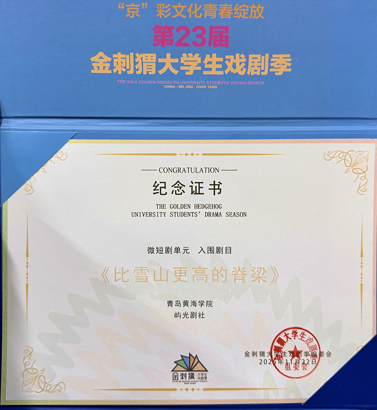 近日,第23届“金刺猬”大学生戏剧季在北京圆满落幕。作为国内最具影响力的大学生戏剧平台,本届赛事吸引了来自清华大学、北京大学、中央戏剧学院、上海戏剧学院等132所高校的406部作品。由我校影视学院表演系教师孟琪执导,表演系主任刘丹、表演系教师刘冠尚与2023级戏剧影视表演专业学生联合创作的戏剧小品《比雪山更高的脊梁》,经过多轮激烈角逐,成功入围“微短剧单元”,展现了黄海学子扎实的专业素养与艺术创造力。