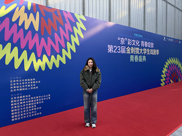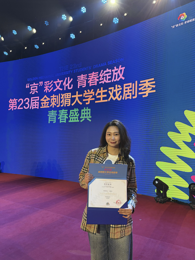 本届金刺猬戏剧季由北京市文化和旅游局、北京市文学艺术界联合会、共青团北京市委员会及北京市朝阳区人民政府联合主办。活动颁奖典礼于11月22日在北京郎园Station准点剧场举行,北京市文化和旅游局一级巡视员马文、北京戏剧家协会副主席王宝社、朝阳区委常委、宣传部部长冯志明等领导出席,国家一级演员、中国戏剧梅花奖及上海白玉兰奖获得者许娣亲临现场并为获奖团队颁奖。我校教师孟琪作为代表受邀参加典礼,与全国戏剧界专家学者共同见证了这一青春戏剧盛宴的圆满收官。
