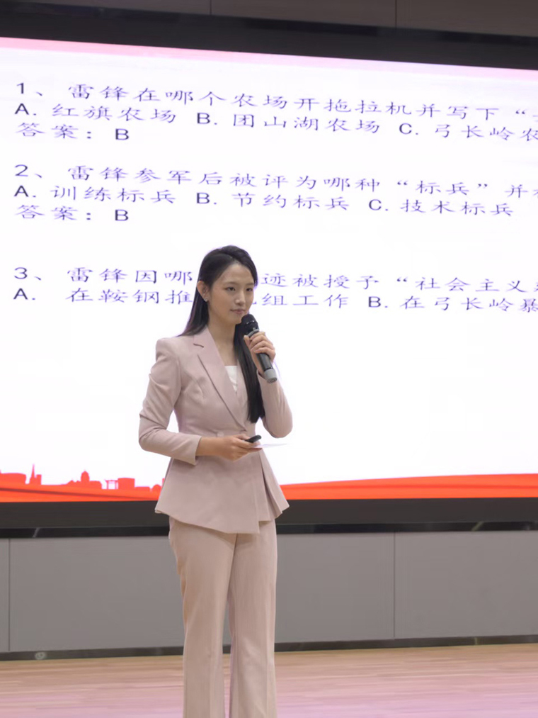在雷锋演讲落下帷幕后,一场别开生面的“螺丝钉精神”挑战赛随即开启。活动现场设置了趣味知识问答环节,主持人热情洋溢地随机邀请台下观众参与互动,问答内容紧紧围绕雷锋生平轶事、“螺丝钉精神”的核心要义,以及雷锋精神在当下的传承价值展开。参与者们踊跃应答,思路清晰,展现出对雷锋相关知识的扎实储备与深刻认同。答对问题的同学还收获了精心准备的惊喜礼品,欢快的笑声与热烈的掌声此起彼伏,将现场活跃的氛围推向高潮。