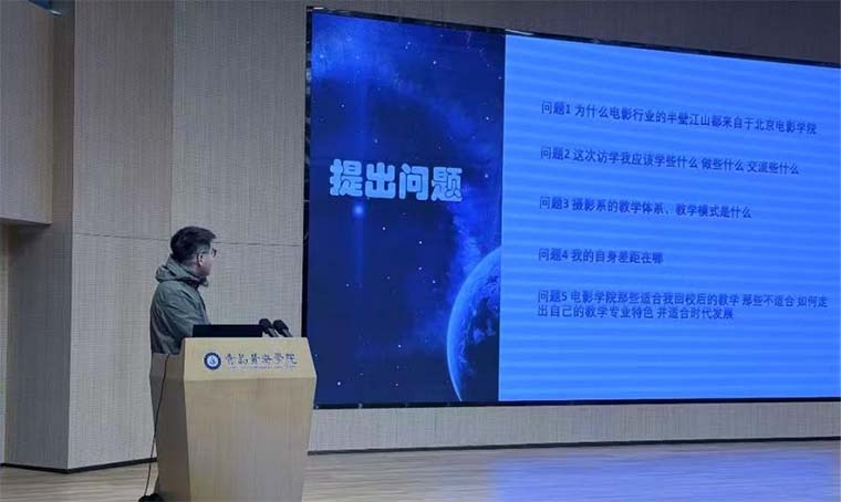 分享会伊始,杨帅老师抛出“为何电影行业半壁江山出自北京电影学院?”“访学期间该学什么、做什么、交流什么?”“北京电影学院摄影系的教学体系与模式是什么?”“自身专业差距在哪里?”“哪些经验可适配回校教学、如何打造契合时代发展的专业特色?”五大核心问题,清晰锚定了本次访学与分享的核心脉络。