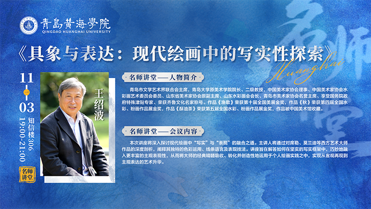 2025年11月3日,青岛黄海学院设计与美术学院名师讲堂在知信楼306报告厅成功举办。青岛市文学艺术界联合会主席、青岛大学原美术学院院长、二级教授,中国美术家协会理事、中国美术家协会水彩画艺术委员会委员、山东省美术家协会原副主席、山东水彩画会会长、青岛市美术家协会名誉主席王绍波教授应邀来校,以《具象与表达:现代绘画中的写实性探索》为题,为我院师生带来一场学术盛宴。