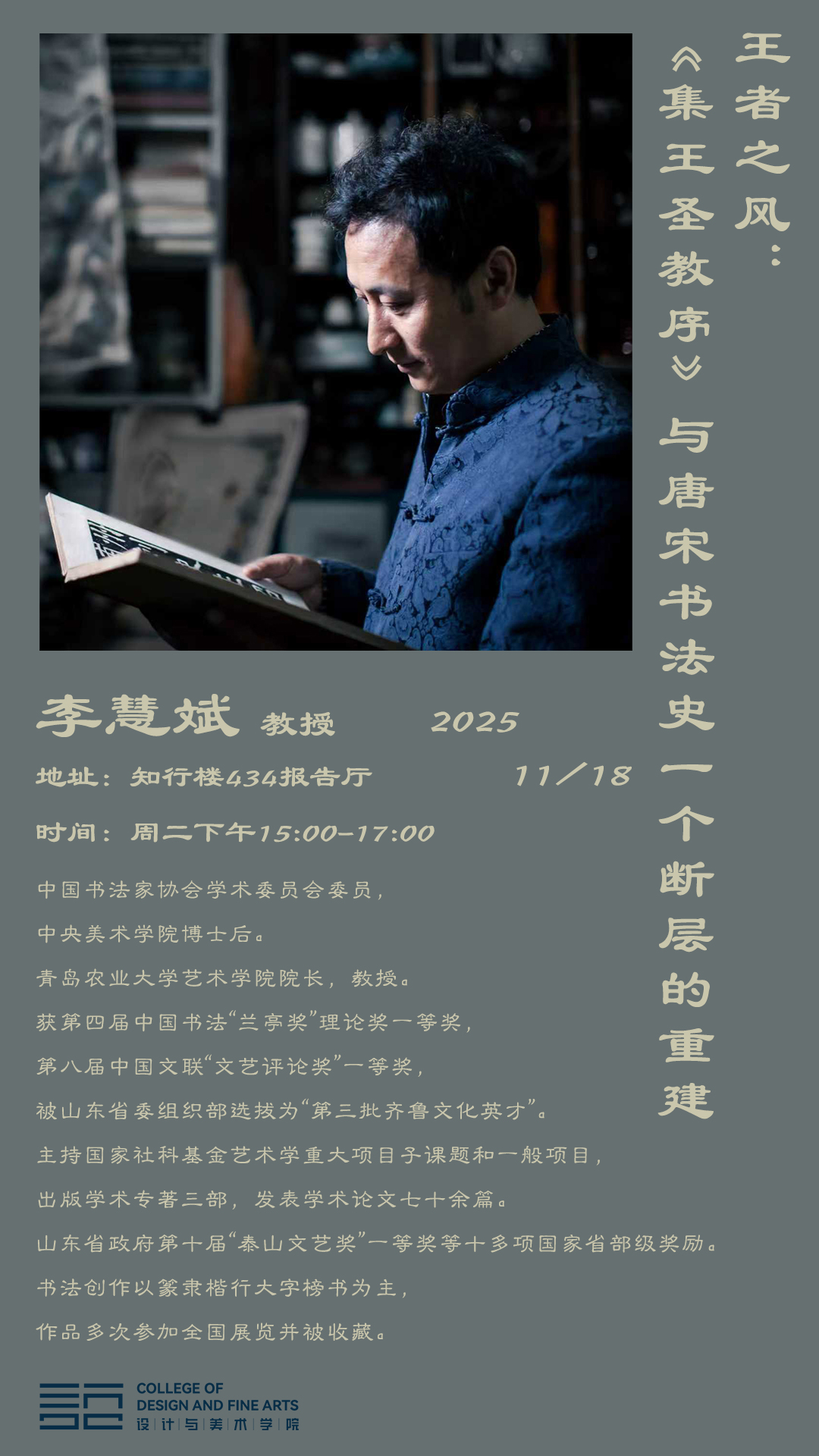 本次讲座特邀中国书法家协会学术委员会委员、中央美术学院博士后、青岛农业大学艺术学院院长李慧斌教授担任主讲,为在场师生带来了一场关于唐宋书法史的深度学术盛宴。
