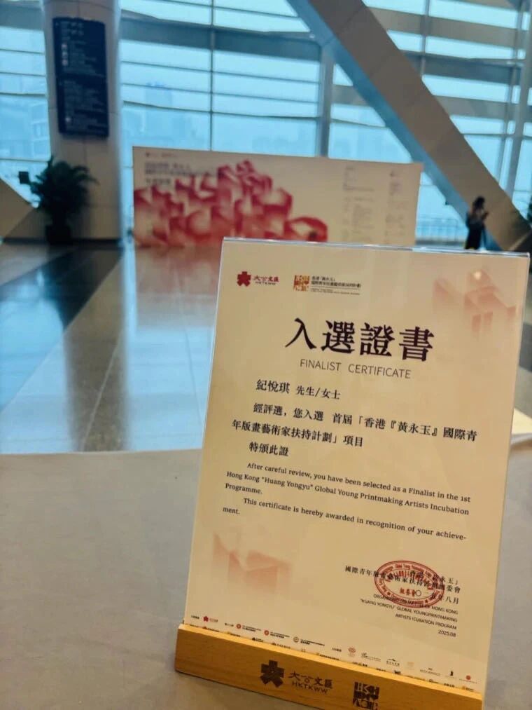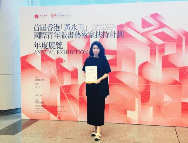 8月4日首届“香港‘黄永玉’国际青年版画艺术家扶持计划”年度展览在香港会展中心举行开幕式。该计划由香港大公文汇传媒集团发起,联合香港特区政府文化体育及旅游局、民政及青年事务局共同主办,自启动以来吸引了近千位全球青年艺术家踊跃参与,竞争激烈。纪悦琪博士凭借其独特的创作理念与精湛技艺,在层层评选中脱颖而出,展现了黄海学院艺术教育的卓越成果。