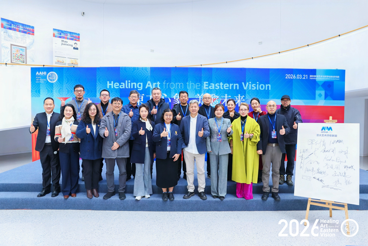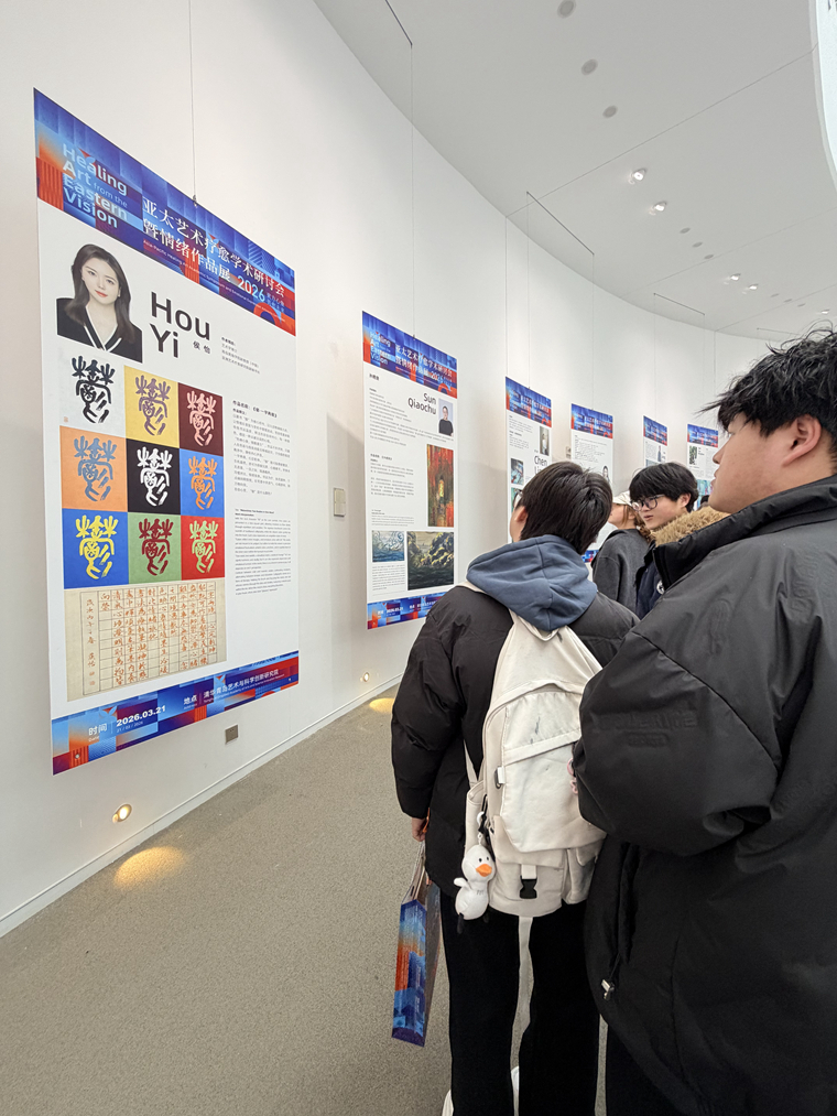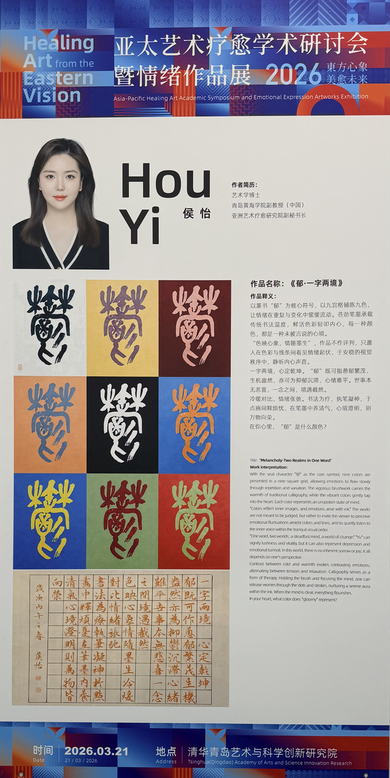 2026年3月21日在清华青岛艺术与科学创新研究院举办“东方心象·美愈未来——亚太艺术疗愈国际学术研讨会暨情绪作品展”,设计与美术学院院长邵力民,书法专业教师侯怡及书法系23名学生代表应邀参加此次活动。