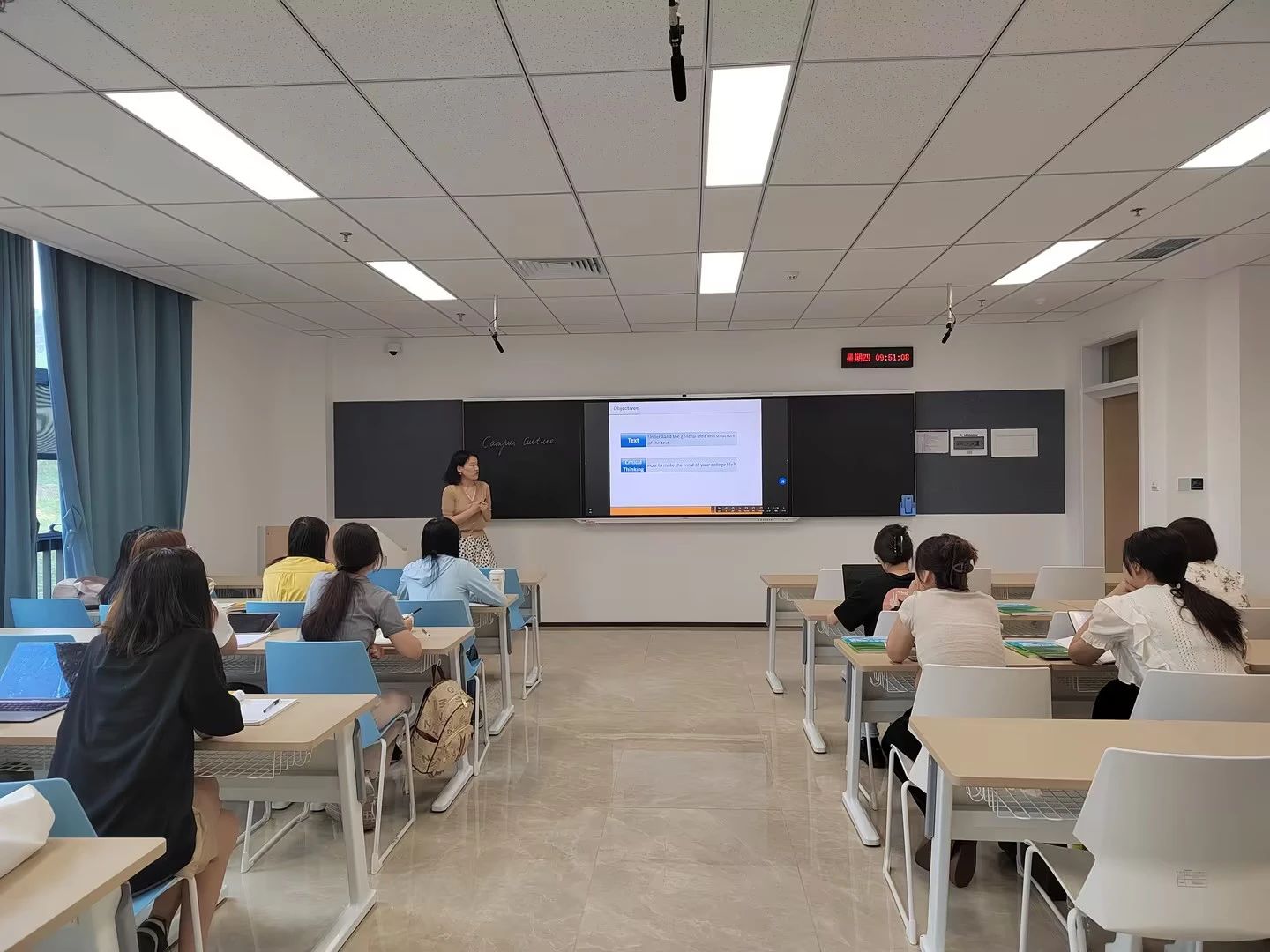 在示范课环节,张帅老师就Campus culture主题进行了精彩的授课展示。张老师流利的英语口语、生动的教学案例和深入浅出的讲解方式利于其授课对象沉浸于大学文化环境中,她通过巧妙的问题引导、小组互动讨论和即时反馈帮助学生快速掌握文章主旨并适当融入育人教育。示范课赢得了在场新教师们的一致好评,也为新教师们提供了宝贵的教学示范。