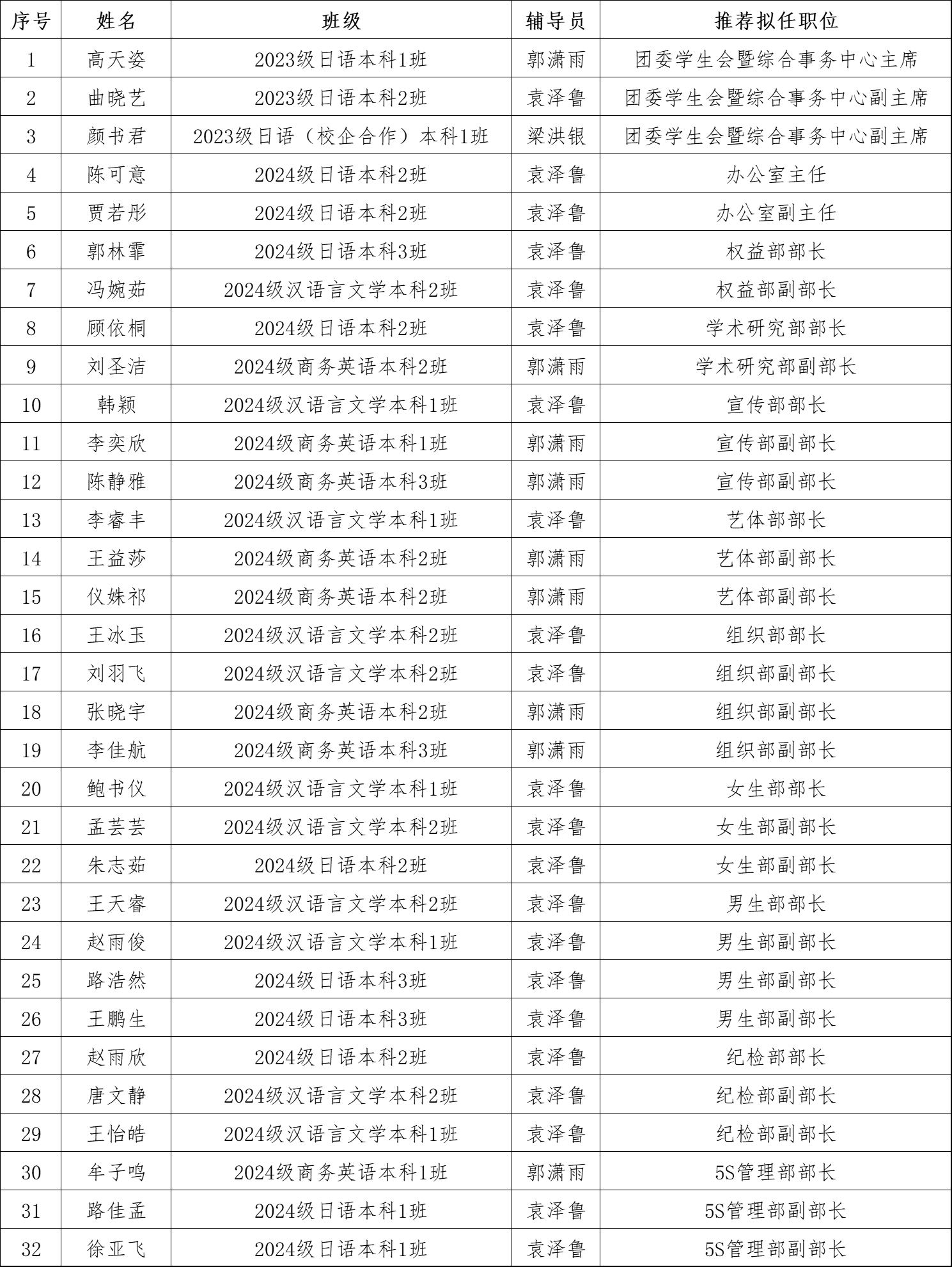 经过公开报名、资格审查、换届演讲以及学院学生工作小组讨论等严格选拔程序,一批综合素质过硬、工作能力突出、群众基础扎实的优秀学生脱颖而出。现将青岛黄海学院语言文化学院第三届团委学生会暨综合事务中心学生干部拟任名单公示如下:
