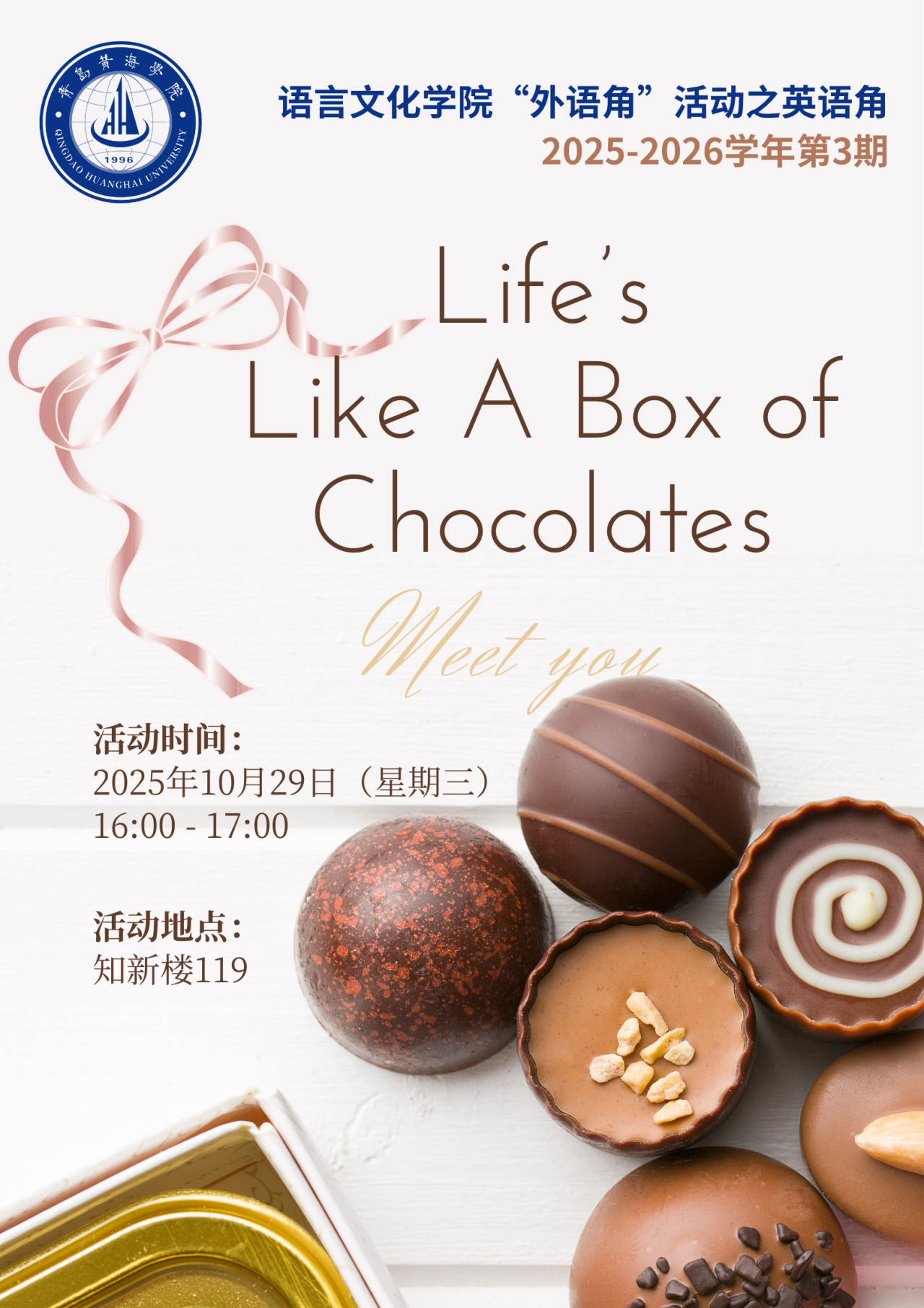 在本周的第三期英语角活动我们将一起聊聊:生活中的“巧克力时刻”:那些让你措手不及或感动不已的瞬间;面对生活的不确定,你是如何选择和应对的?如果人生是一盒巧克力,你觉得自己是哪一种口味?让我们用英语交流,用故事分享,用笑声和思考,为生活“增添一点甜”