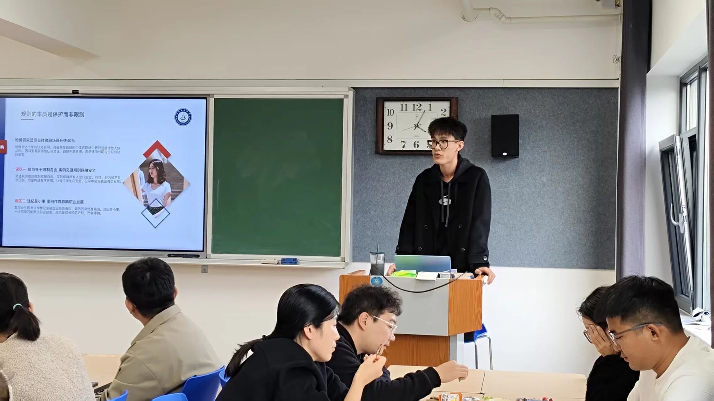 从行为规范的底层逻辑出发,袁老师系统梳理了课堂秩序、交通出行、宿舍生活、公共活动四大场景的管理要求,提出通过“案例提问”方式,引导学生从被动接受转向主动重视安全。
