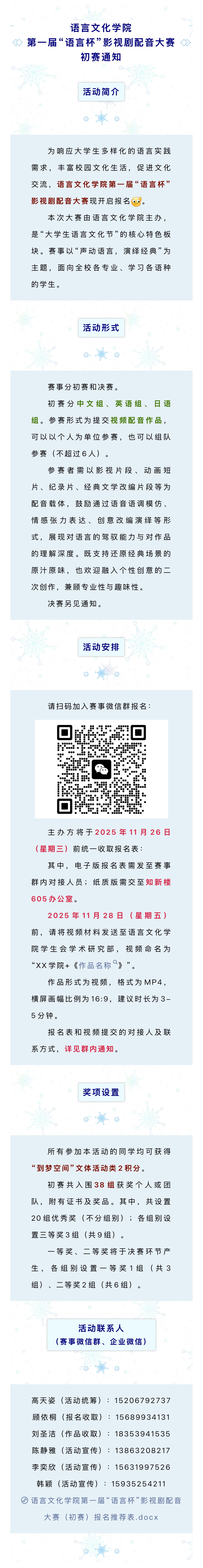 语言文化学院第一届“语言杯”影视剧配音大赛初赛开始报名啦!