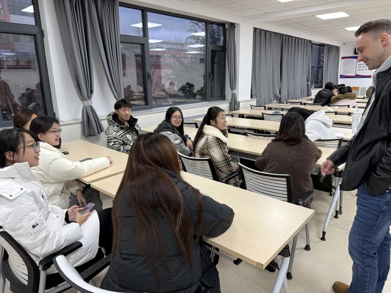 12月10日下午,语言文化学院第六期英语角活动在知新楼202教室如期举行。本期活动以“A or B?(你会怎么选?)”为主题,由英语系骨干教师吕琳主持,外教聂瀚全程参与,数十名学生踊跃加入,现场气氛热烈。