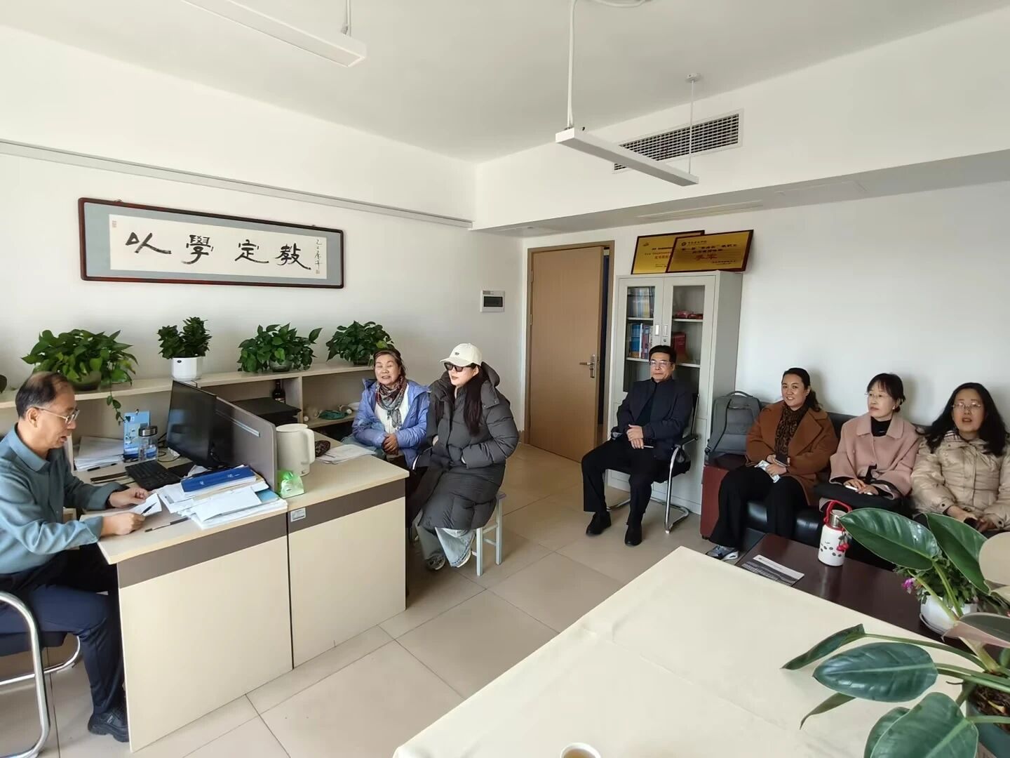 答辩开始前,语言文化学院副院长武学锋、英语系主任崔晓雷、毕业论文负责人綦青及各答辩组组长在知新楼601召开工作会议。