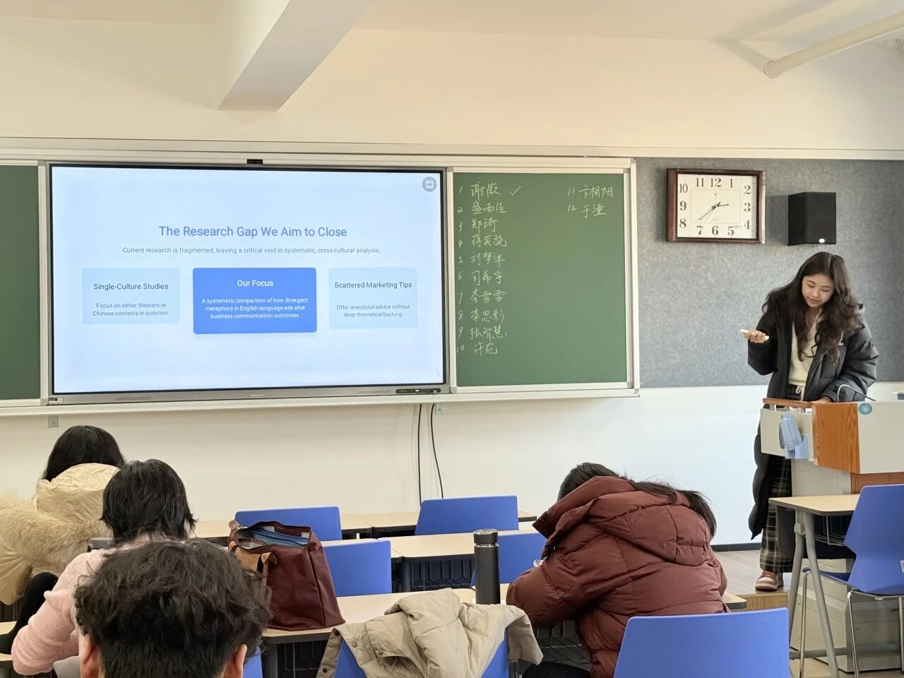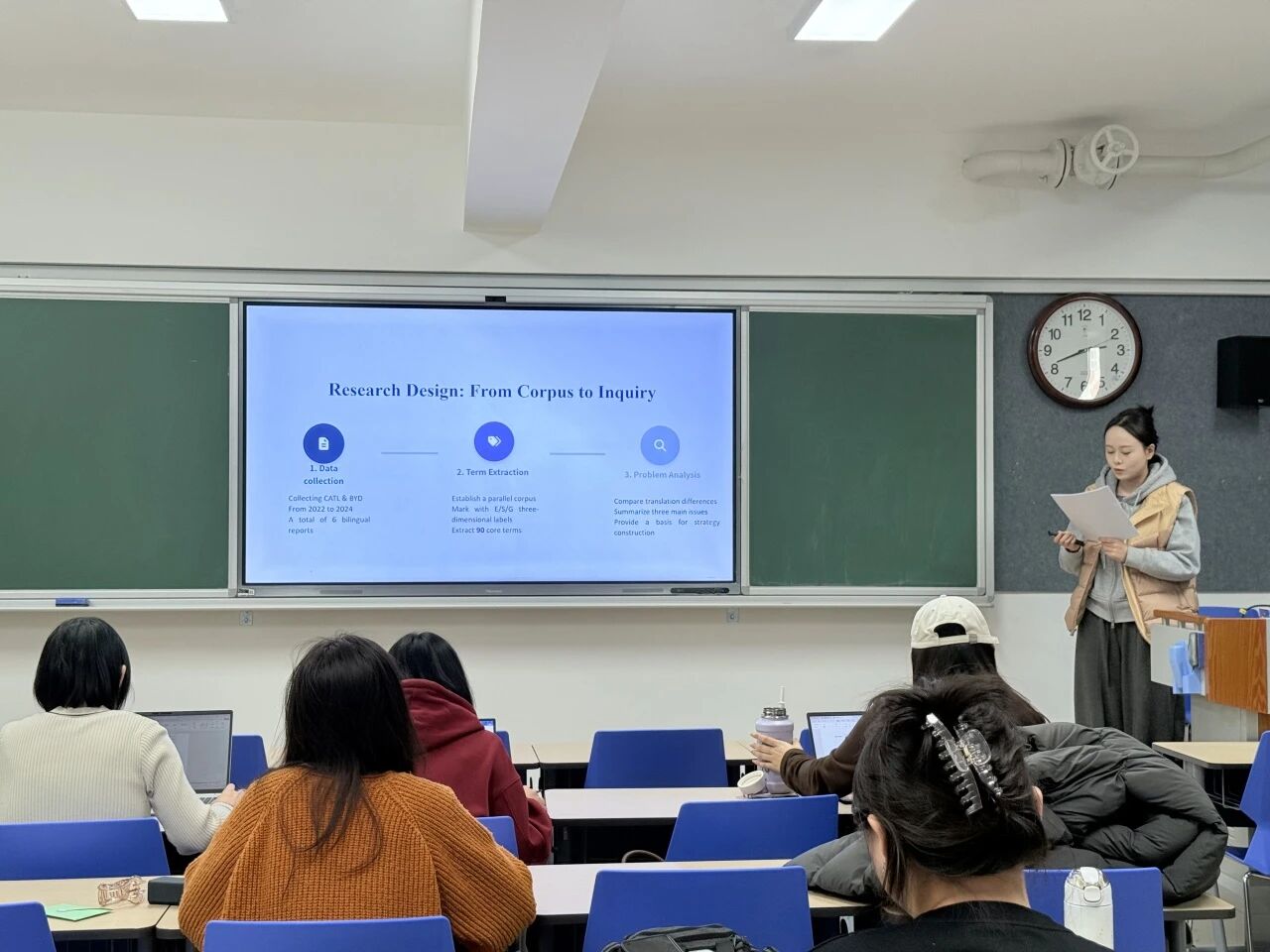 下午2时15分,各组答辩有序启动,严格遵循“学生陈述—评委提问—现场答辩—综合评议”的标准流程。陈述环节中,同学们全程使用英语,清晰阐述选题背景、研究意义、文献综述、研究方法及预期成果,展现了专业功底。