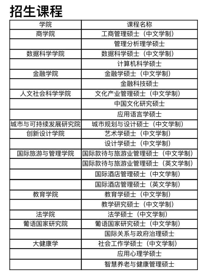 澳门城市大学现有学生近13,000名,设有商学院、数据科学学院、金融学院、人文社会科学学院、大健康学院、创新设计学院、国际旅游与管理学院、教育学院、法学院、葡语国家研究院、城市与可持续发展研究院等11个学院,提供12个学士学位、22个硕士学位及15个博士学位的近50种中英文制课程。大学实践“国际学习”、“体验学习”、“跨文化学习”、“同伴学习”与“增值学习”并行的多元学习模式。现时,澳门城市大学是澳门五所开展“本、硕、博”全层次办学的综合性大学之一。城大跻身泰晤士高等教育2026年度世界大学排名,位列601-800位;上榜QS2026年度亚洲大学排名,位列433位。城大持续提升教学质量,“社会科学总论(SOCIAL SCIENCES, GENERAL)”进入科睿唯安基本科学指标数据库(ESI)全球前1%,彰显大学在人文社科学科领域的特色和优势。同时,城大率先开展课程国际权威认证,旅游业管理专业的博士、硕士、学士学位课程为均获联合国世界旅游组织(UNWTO)TedQual优质教育素质认证的特色课程;“旅游休闲管理”与“经济学”双双上榜软科2025世界一流学科排名,“旅游休闲管理”位居全球第37位,“经济学”位居全球301-400位。