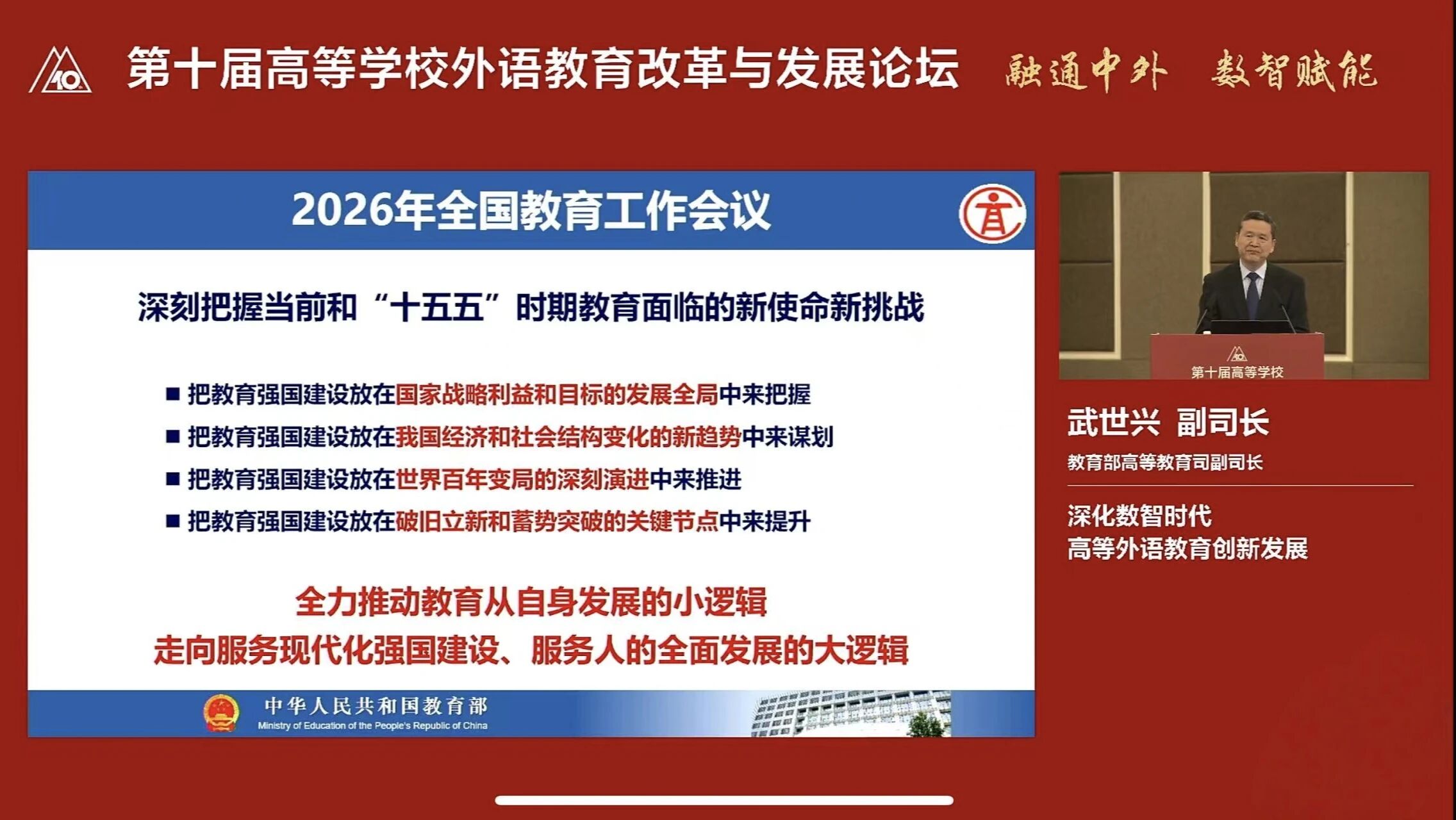 论坛汇聚了教育部相关领导、外语教育及教育数字化领域的知名专家学者、全国高校外语院系负责人及骨干教师。开幕式后,教育部高等教育司副司长武世兴作主旨报告,围绕“深化外语教育改革,服务教育强国建设”的宏观战略,从“教育数字化战略引领外语教育转型”“课程思政与外语教学内涵建设”“外语教学新形态生态重构”“拔尖创新人才培养”四个维度系统阐述。报告强调,外语教育需以“数智赋能”为引擎,以“价值引领”为核心,着力培养有家国情怀、全球视野和专业本领的复合型涉外人才,为新时代外语教育的改革发展指明了方向。