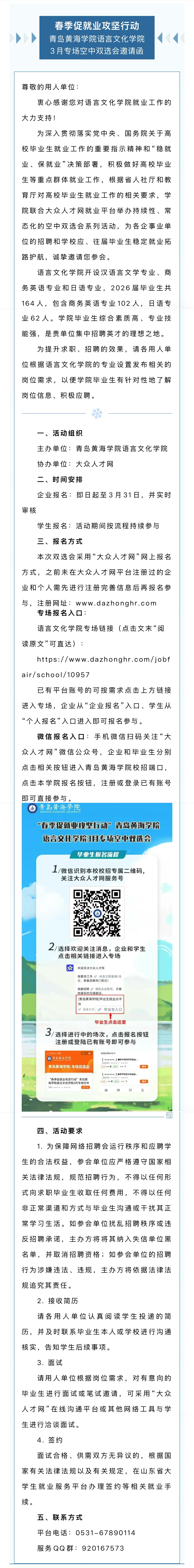 青岛黄海学院语言文化学院3月专场空中双选会邀请函