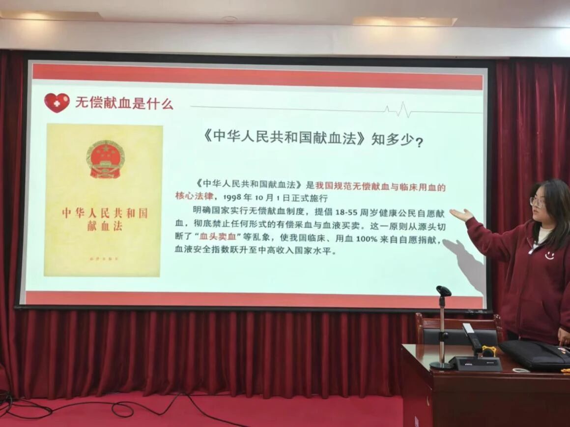 王希哲以《中华人民共和国献血法》为核心,结合精心准备的课件,系统讲解了我国无偿献血制度的法律内涵与社会价值。她重点阐述了《献血法》关于年龄的规定、献血安全措施及血液使用规范,并通过真实案例说明每一份血液对患者的重要意义。