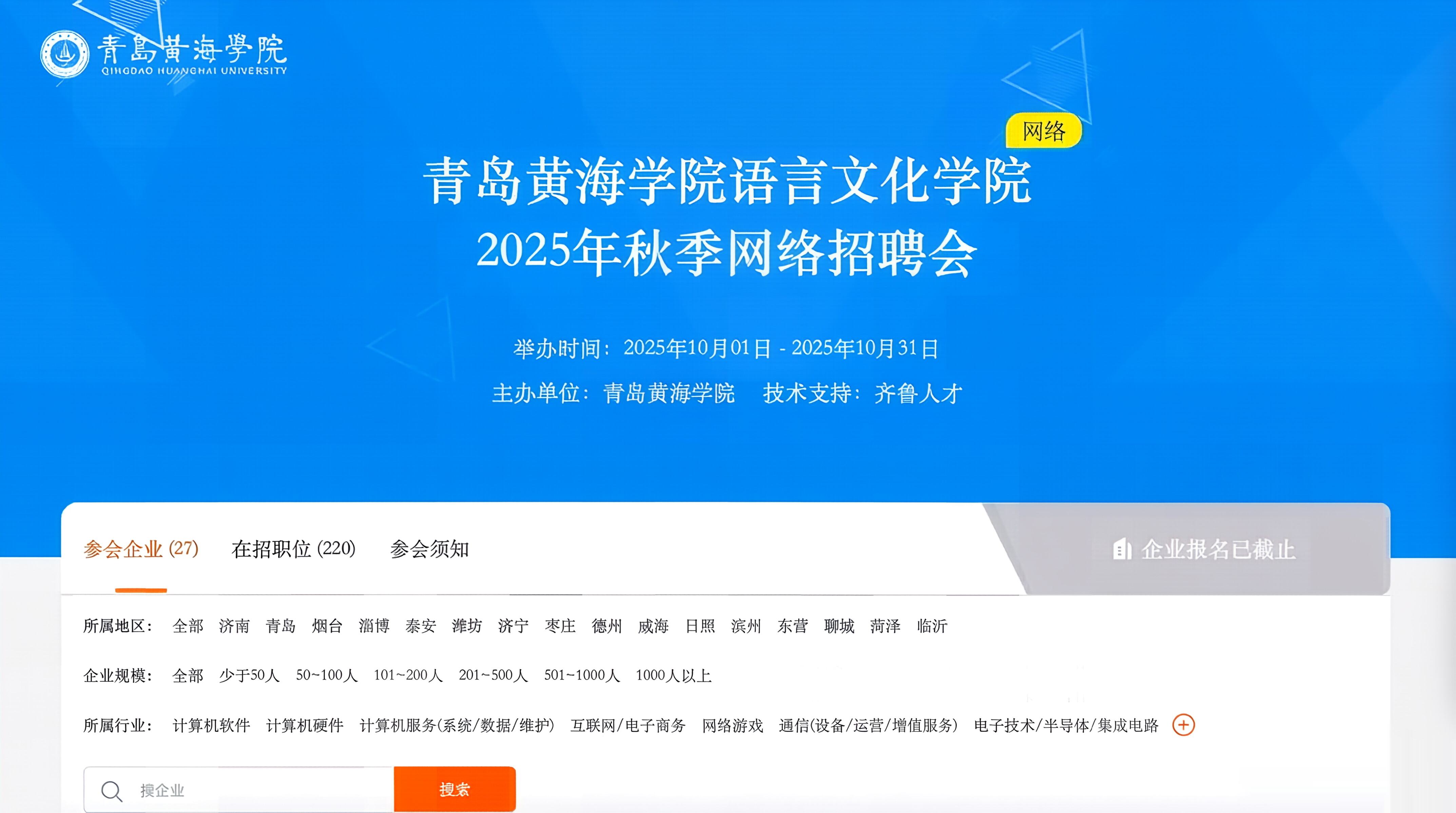 本次招聘会延续线上云端模式,招聘周期为2025年10月1日-10月31日,由青岛黄海学院主办、齐鲁人才提供技术支持,专为语言文化学院学子量身打造就业对接通道,足不出户即可解锁海量优质岗位!