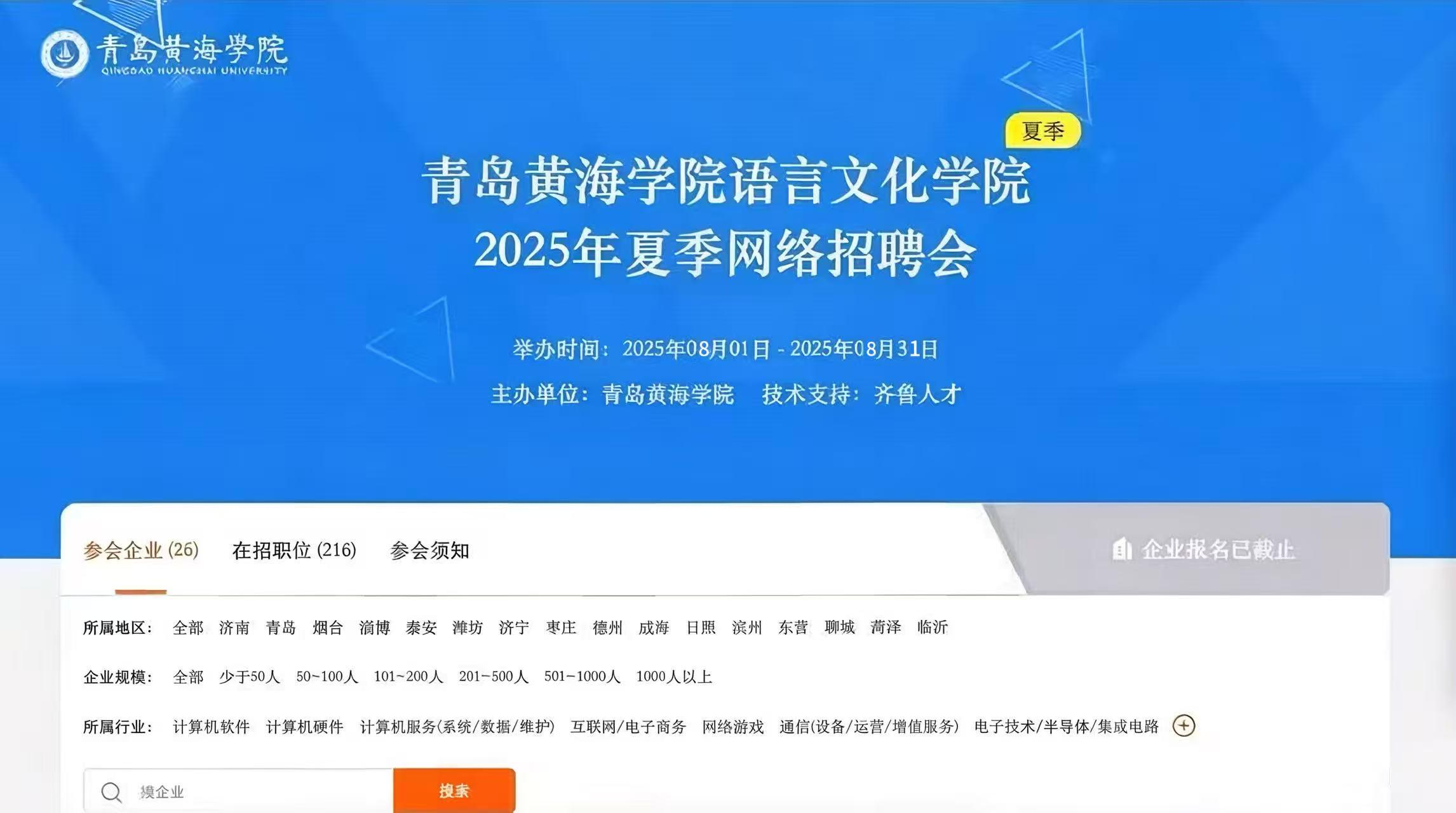 本次招聘会延续线上云端招聘模式,招聘周期为2025年8月1日-8月31日,由青岛黄海学院主办、齐鲁人才平台提供全流程技术支持,面向语言类应届毕业生专属搭建线上求职对接桥梁,足不出户即可对接优质企业、锁定心仪岗位。