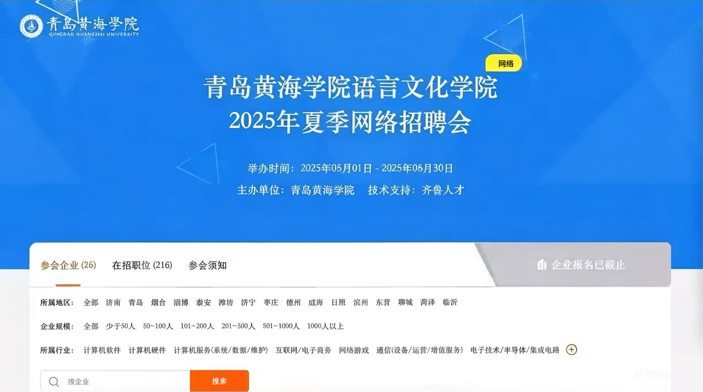 青岛黄海学院语言文化学院2025年夏季网络招聘会盛夏笃行,筑梦启航,正是毕业生求职择业的关键窗口期。为持续助力2025届毕业生高质量充分就业,精准对接优质校企就业资源,青岛黄海学院语言文化学院2025年夏季网络专场招聘会火热开启。