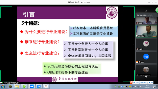 为持续推进我校工程教育专业认证工作,不断开展符合工程教育专业认证的专业建设,系统构建和完善面向产出的应用型本科人才培养模式、课程体系及持续改进机制,使广大教师充分理解 OBE教育理念,为今后的工程教育专业认证奠定基础,6月3日下午,智能制造学院组织召开第2期工程教育论坛,特邀重庆科技学院何高法教授,面向全校教师作题为"基于OBE教育理念的专业建设"专题讲座。智能制造学院院长刘纪新、教学副院长曹爱霞及学校部分骨干教师通过腾讯会议共同聆听了本次报告,报告由刘纪新院长主持。