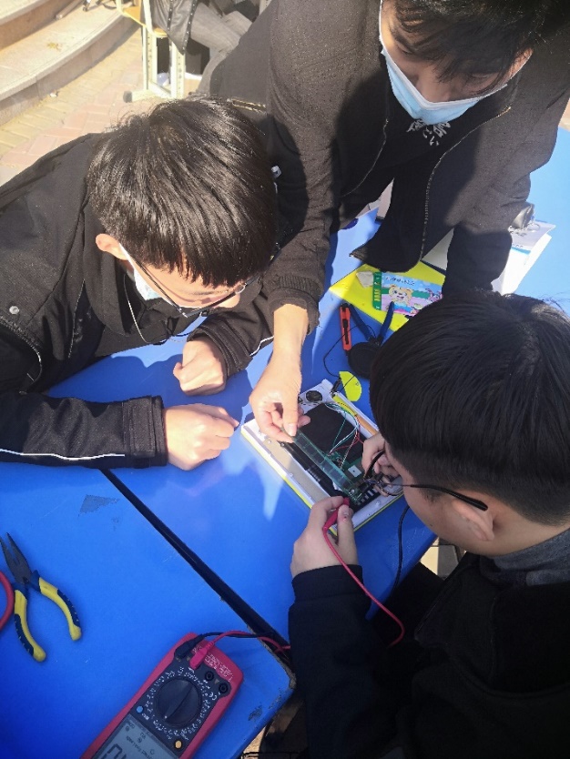 活动现场小区人们拿着各种电子产品物件前来维修,社团成员对前来维修的物件依次进行编号,有大个头的家用电器,也有一些小玩具需要维修,社团成员们仔细检查、认真修理。有些电器很快就被修好,当然有些物件经过诊断被下达了“危书”。现场维修的电子创新协会成员尽最大努力对这些电器进行着最后的“抢救”,在此次维修活动中,大家都施展着各自的绝技,拯救着“奄奄一息”的家电。