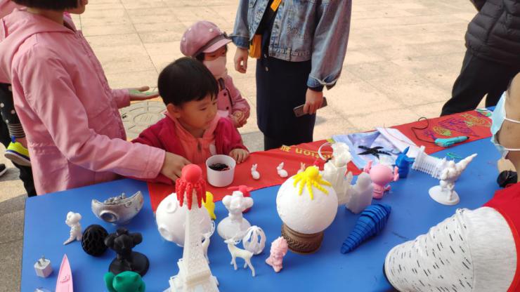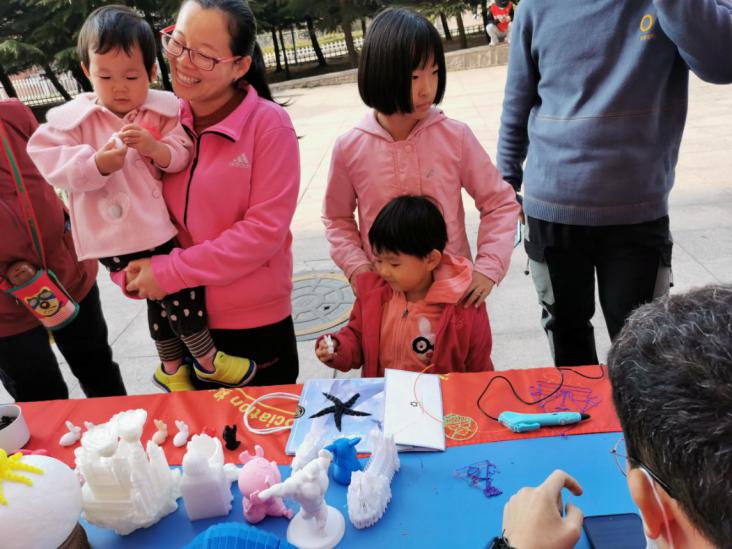前来参与活动的很多都是周边社区老师们,他们带着自己的宝宝前来体验。在活动中,孩子们对3D打印技术产生了浓厚的兴趣,争抢着要试一下打印笔,打印自己喜欢的物体,问各种有趣的关于打印方面的知识:哥哥,能不能打印个月亮?能不能打印人,能不能打印作业?等等,稚嫩的声音引得现场不时发出阵阵笑声,娱乐中学习,学习中享受乐趣。协会成员提前打印了小兔子、小章鱼等,送给了到现场的小朋友们。