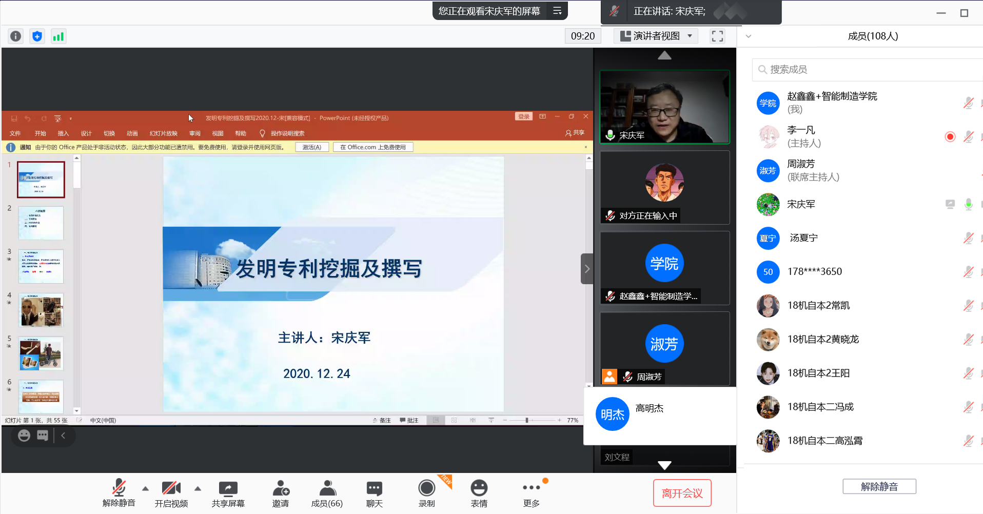 12月24日晚,智能制造学院邀请山东科技大学宋庆军副教授为我院师生做了一场题为《发明专利挖掘与撰写》的讲座,我院师生110余人通过腾讯会议在线参与本次的学习与交流。