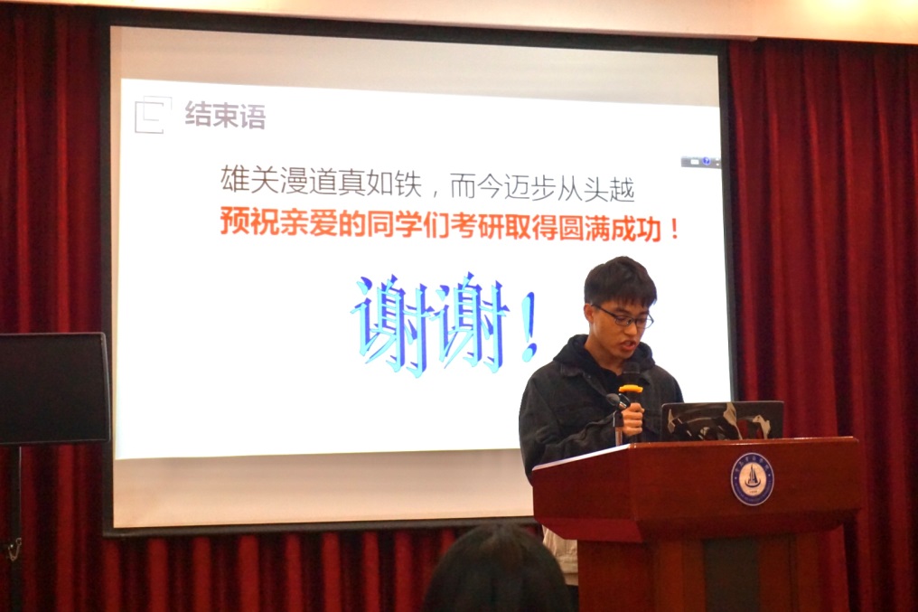 随后学院2021考研成功的学生代表单长鹏、戴文凯两位同学结合自己考研经历从复习规划、复习资料选择、院校专业选择、时间安排等方面较为全面的给同学们进行了分享。