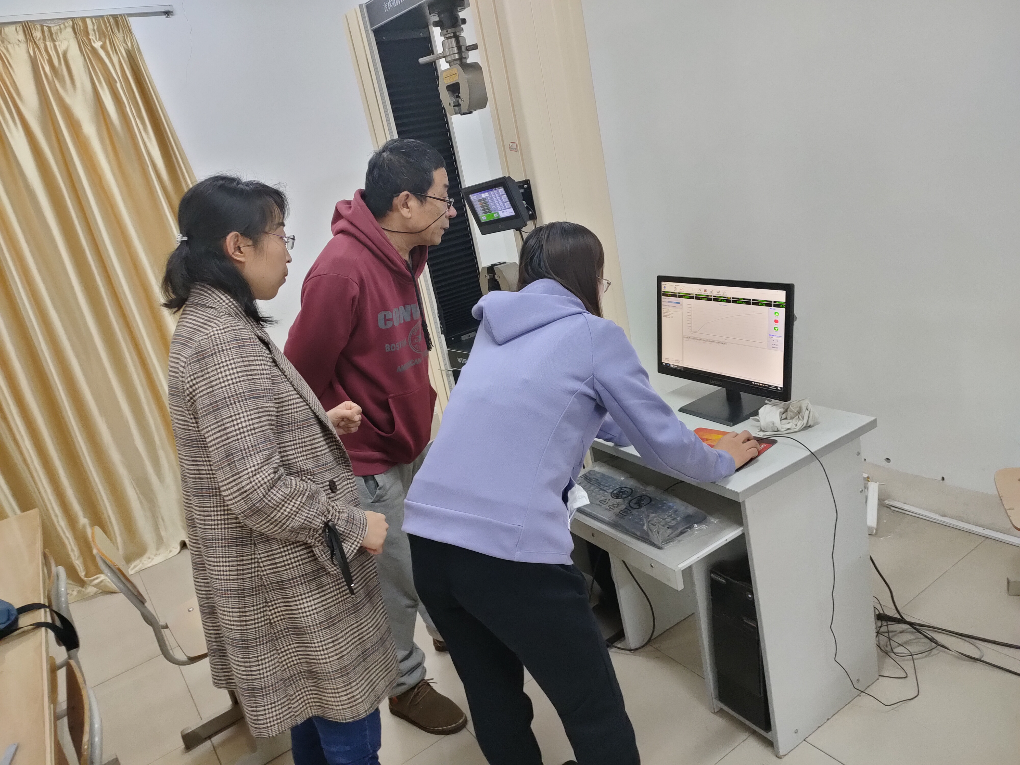 为了材料力学和工程力学实验课程更好的进行,机械工程系机械基础教研室与4月26日下午进行了轴向拉伸和轴向压缩实验操作的研讨。李振钢教授、教研室主任葛伟伟老师和孟凡芳老师在114力学实验室进行了现场的操作研讨。对于实验的准备工作、设备的操作、万能试验软件中参数的设置等问题进行了详细的讨论,制定了多套实验方案,每位老师可根据班级人数的不同修改实验数据,在课程时间内有效的完成实验过程。