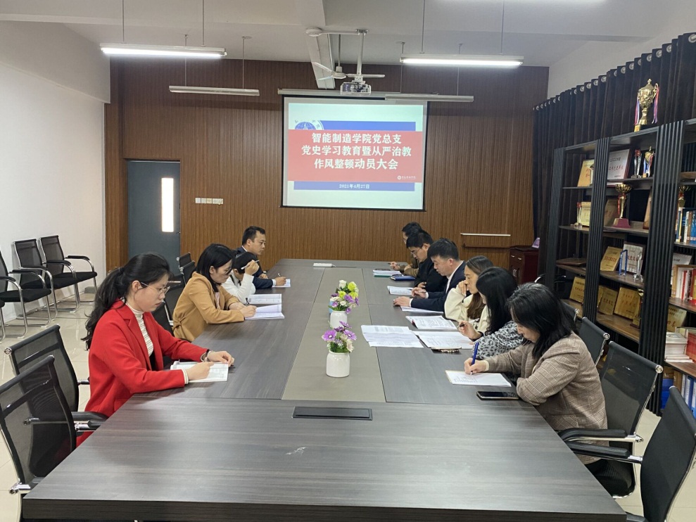 4月27日下午,智能制造学院党总支召开党史学习教育暨从严治教作风整顿工作会议。会议由智能制造学院党总支书记孙丰鑫主持,院党总支成员、支部书记、各支部组织、宣传委员和小组长参加会议。