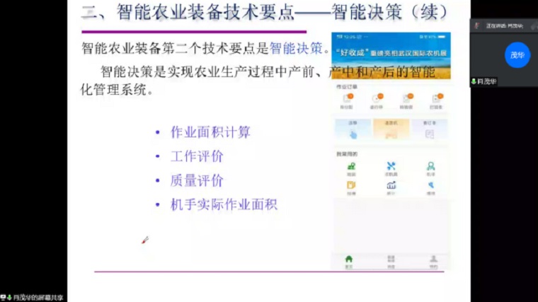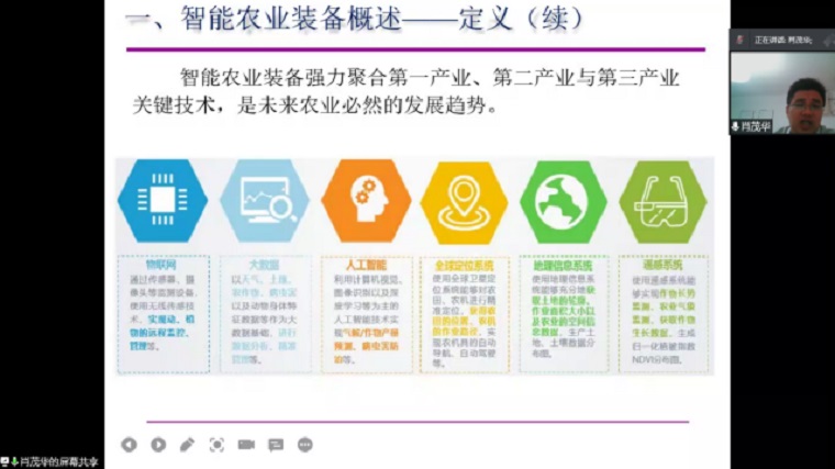 会上,肖茂华教授首先以汽车的无人驾驶技术引出智能农机装备的发展状况及碳达峰碳中和相关概念,分别从智能农业装备概述;智能农业装备技术要点;智能农业装备应用现状;智能农业装备发展趋势等四个方面进行分享。