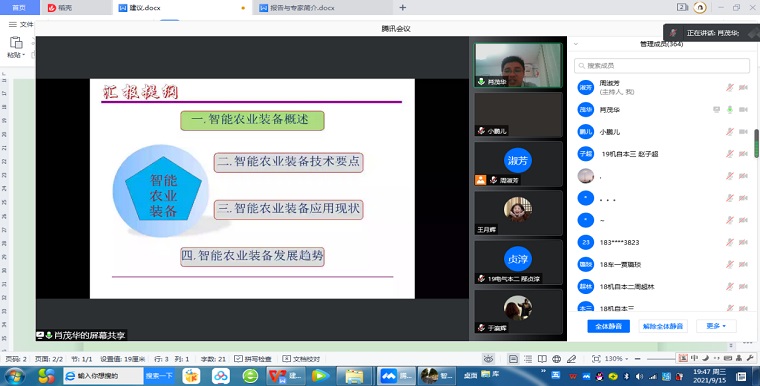 全国科普日于2003年开始实施,是中国科协组织全国学会和地方科协每年都举行的一项活动。2021全国科普日的主题是“百年再出发,迈向高水平科技自立自强”,9月11-17日在全国各地集中开展。“倡导绿色发展,服务生态建设”是今年科普活动的一项重要内容,为此,智能制造学院特筹办了为期三天的“碳达峰碳中和科普专家讲坛”,9月15号晚,组织召开第一场科普专家讲坛活动,特邀南京农业大学肖茂华教授面向智能制造学院全体师生作题为“面向“碳中和”的智能农业装备技术”专题报告。智能制造学院370余名师生通过腾讯会议共同聆听了本次报告,报告由智能制造学院院长助理陈玉杰教授主持。