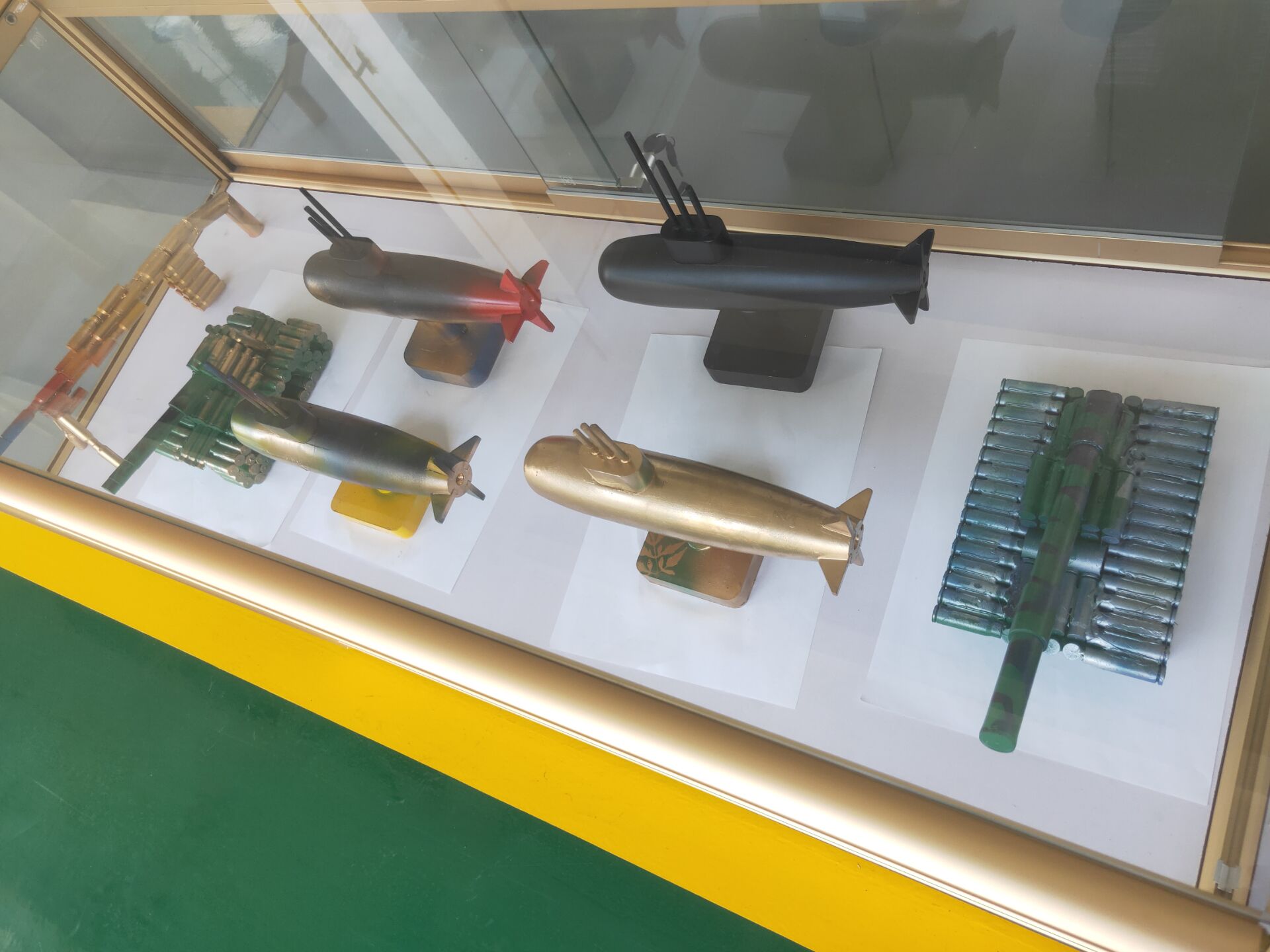 潜艇作品由11个零部件组装而成,分别为艇身1件、艇仓1件、尾翼4件、雷达线3件、底座1件、底座支撑轴1件。