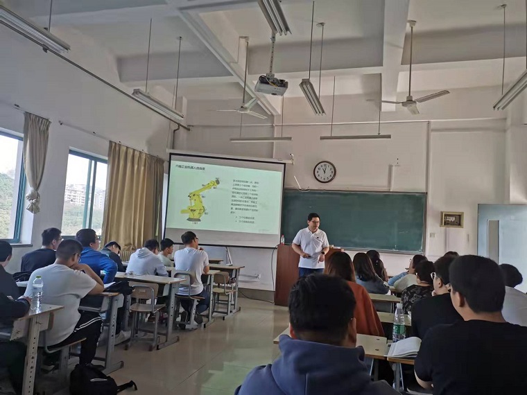 卢总监从机器人基本概念、机器人发展历史、机器人核心技术、机器人运动控制和机器人机器视觉等方面展开讲解。第一部分主要从机器人的发展里程讲述了机器人的发展历程,就某一张图纸进行详细说明,并结合相关的机器人视频,对于教师在课堂上讲解较抽象的部分做了一定的补充;第二部分结合《机器人学》课程对机器人的运动学部分进行了介绍;第三部分结合《机器人视觉》课程对机器人的图像处理部分进行了介绍。在整个课程讲解过程中,卢总监将自已的工作经历与思考融入课程内容当中,讲解详实、生动有趣,学生听课注意力高度集中,积极参与互动,认真作笔记,通过讲解学生对车间的现场制造机械臂的运动有了深刻清晰的认识。