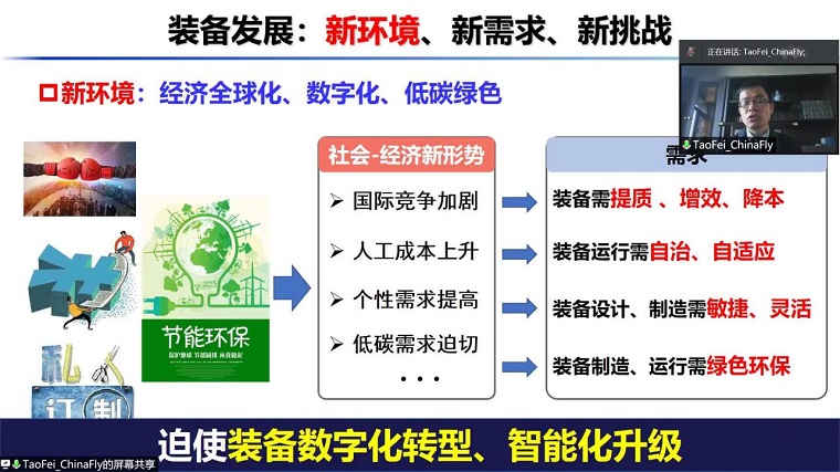 报告四:《未来数字孪生装备》,教育部长江学者、北京航空航天大学陶飞教授主讲。陶教授分析了国内外数字孪生在工业、医学等领域的关注与研究现状,总结了数字孪生在15个领域的应用,并结合其团队在数字孪生五维模型、数字孪生模型评价体系等方面的研究成果,立体化展示了数字孪生系统研发及企业应用案例。