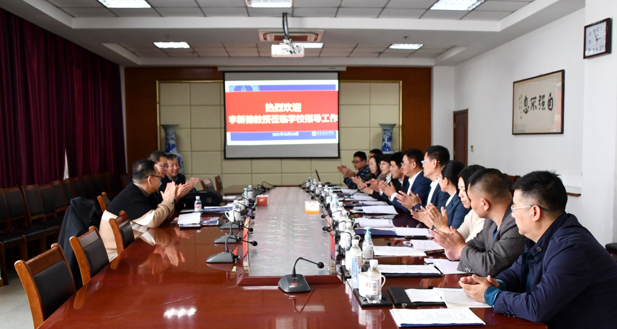 下午,李新德教授指导座谈会在行政楼201举行。学校党委书记邢桂强主持会议,他代表学校对于李新德教授一行的到访表示热烈欢迎,并表示:李新德教授作为中国机器人技术领域最杰出的青年专家之一,希望能为我校智能制造学院相关学科专业提出宝贵的指导意见和建议。校长助理、智能制造学院院长刘纪新向到访人员介绍了学校整体概况,智能制造学院院长助理陈玉杰介绍了学校智能制造学院的发展情况。