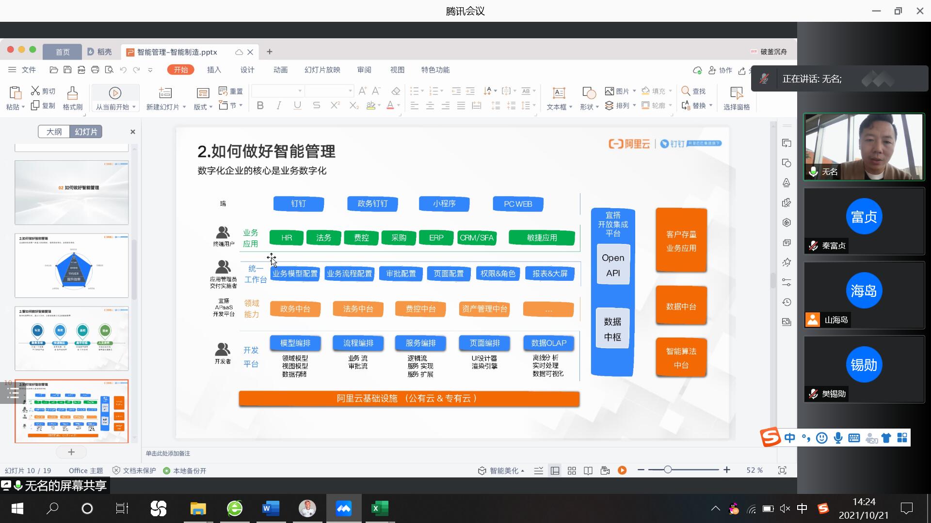 2015级校友-温晓杰,先后担任永泰能源股份有限公司办公室主任、副总工程师、副总经理等职务,现任山西波恩文乐科技有限公司总经理,阿里巴巴钉钉大学讲师。他通过线上方式带来第一个报告,主题为“智能管理与智能制造”。温经理从智能制造与智能管理的关系、如何做好智能管理、如何轻量化实现智能制造三个方面进行了分享,让我们领略了智能制造的魅力。